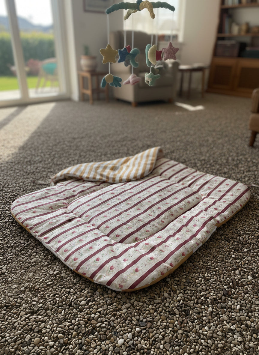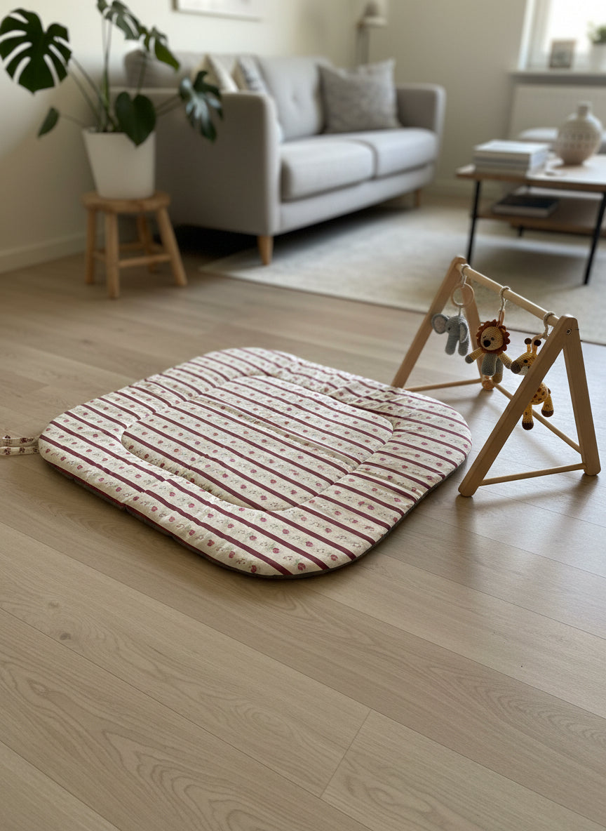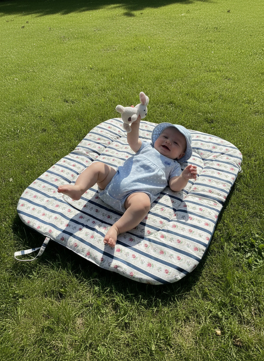 O nosso tapete é leve, prático e fácil de dobrar, cabendo numa mochila ou na base do carrinho. Inclui um laço de transporte, para que o possas levar para todo o lado: sala, quarto, jardim, parque, praia ou qualquer cantinho especial.